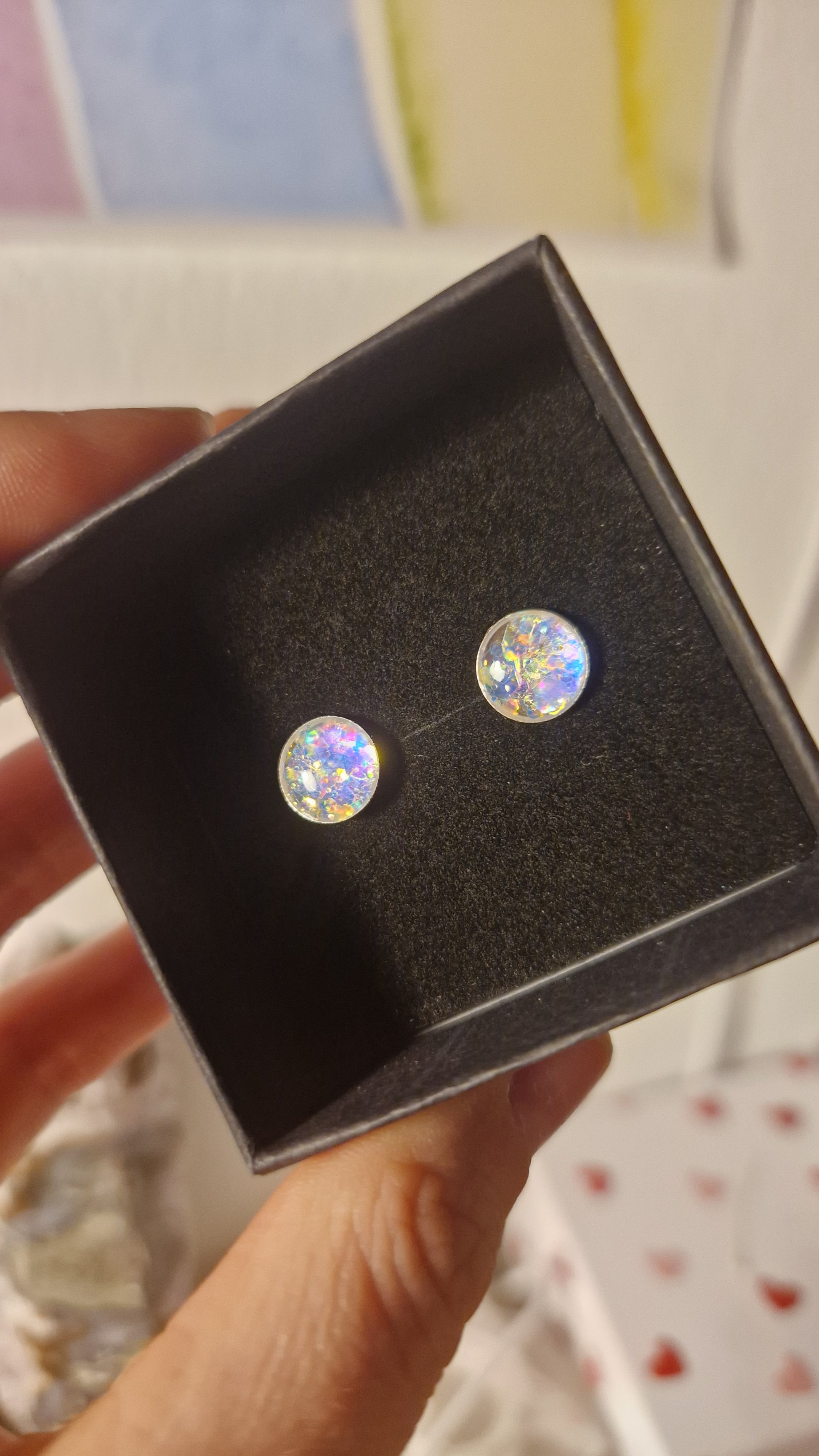 Aurora Lights bringen das magische Schimmern der Polarlichter direkt an dein Ohr. Die zarten 8mm-Stecker bestehen aus hochwertigem 925er Silber und sind mit einer funkelnden Resin-Glitzermischung ausgegossen, die je nach Lichteinfall in irisierenden Pastelltönen aufleuchtet.