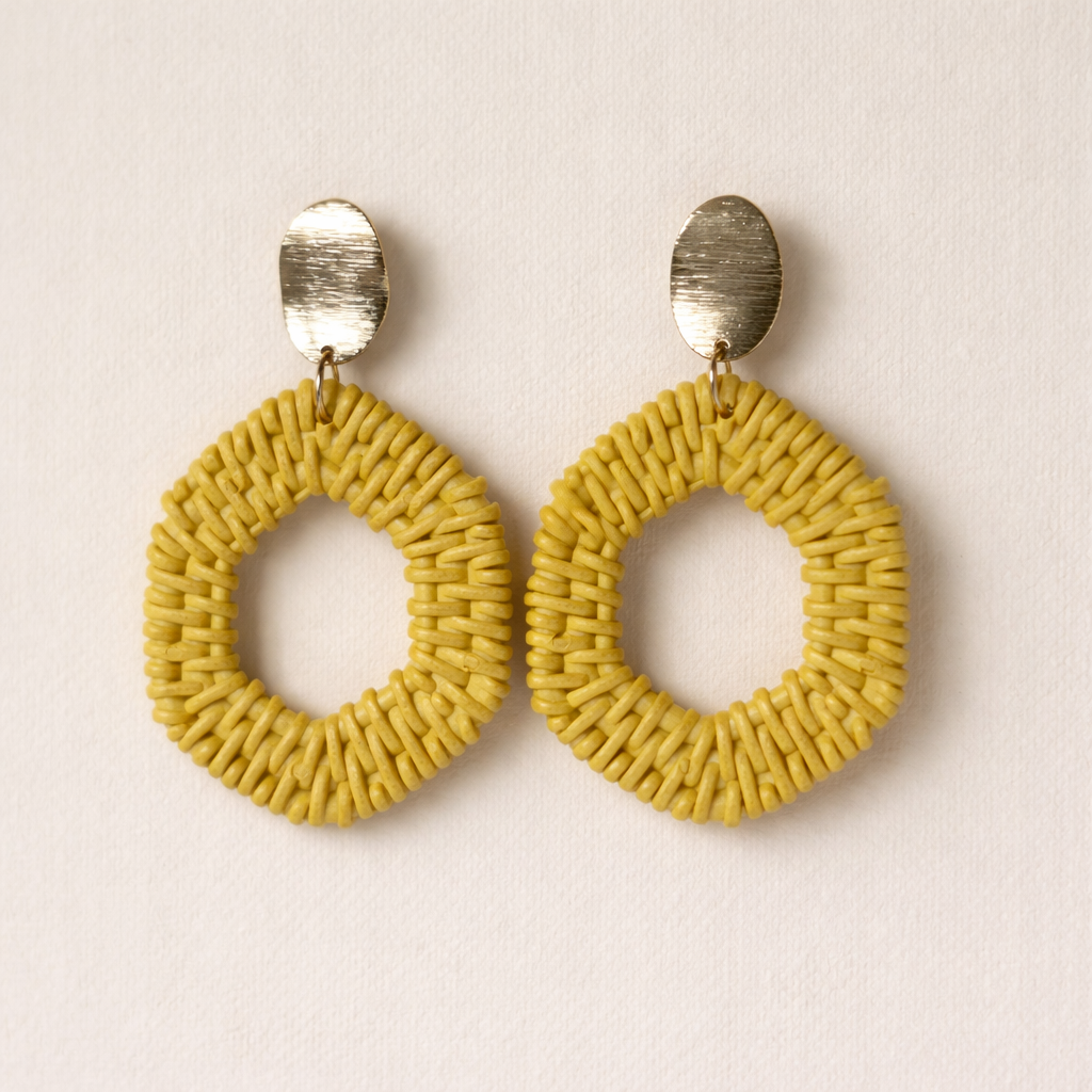 Make a statement with these warm mustard yellow earrings. Made from matte resin with a rattan look, they feature a beautiful oval honeycomb shape. They're versatile and versatile—whether for a relaxed summer look, a trendy boho outfit, or as a pop of color for neutral styles.