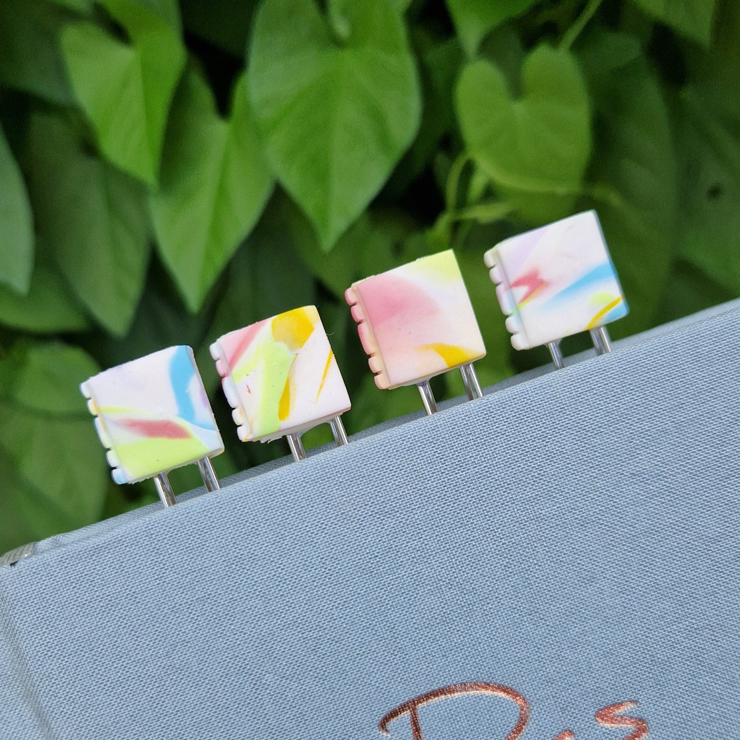 These handmade polymer clay book paper clips are the perfect blend of practical and magical! Each little book sits on a sturdy paper clip and makes an ideal bookmark, planner decoration, or desk highlight.