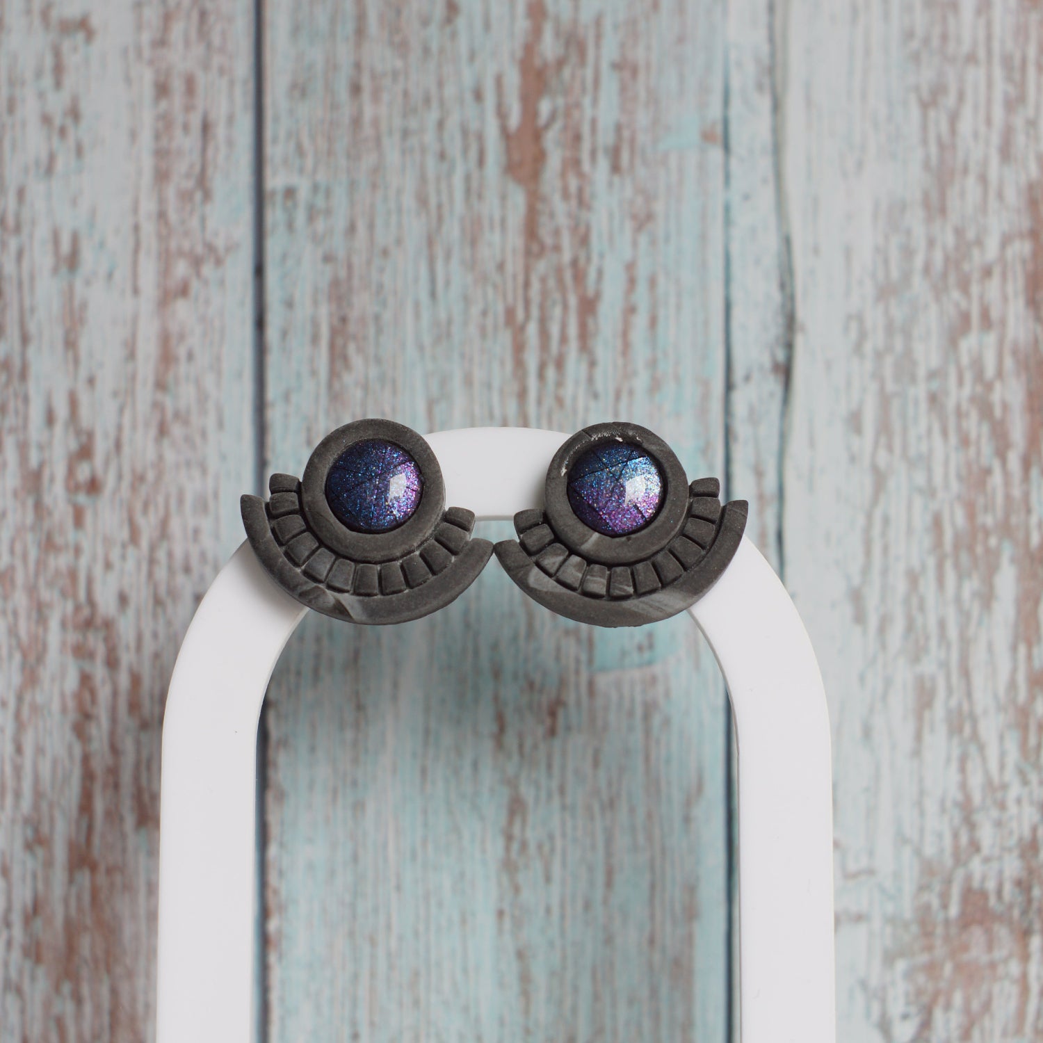 These stylish faux labradorite statement studs feature an elegant, timeless design. The striking inlays mimic the mesmerizing color play of the real stone, with shimmering shades of blue and violet that vary depending on the light. The smooth surface and simple design make them a versatile piece of jewelry that adds a special touch to any look.