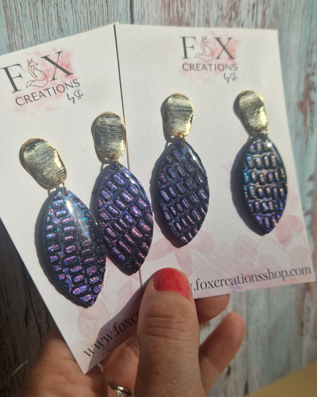 All jewelry pieces are made of polymer clay and lovingly handcrafted. First, the appropriate clay colors are mixed and, if necessary, a pattern is added. The clay is then cut and shaped and placed in the oven for 50 minutes. Once cooled, the pieces are sanded, polished, drilled, and cleaned of fine dust.