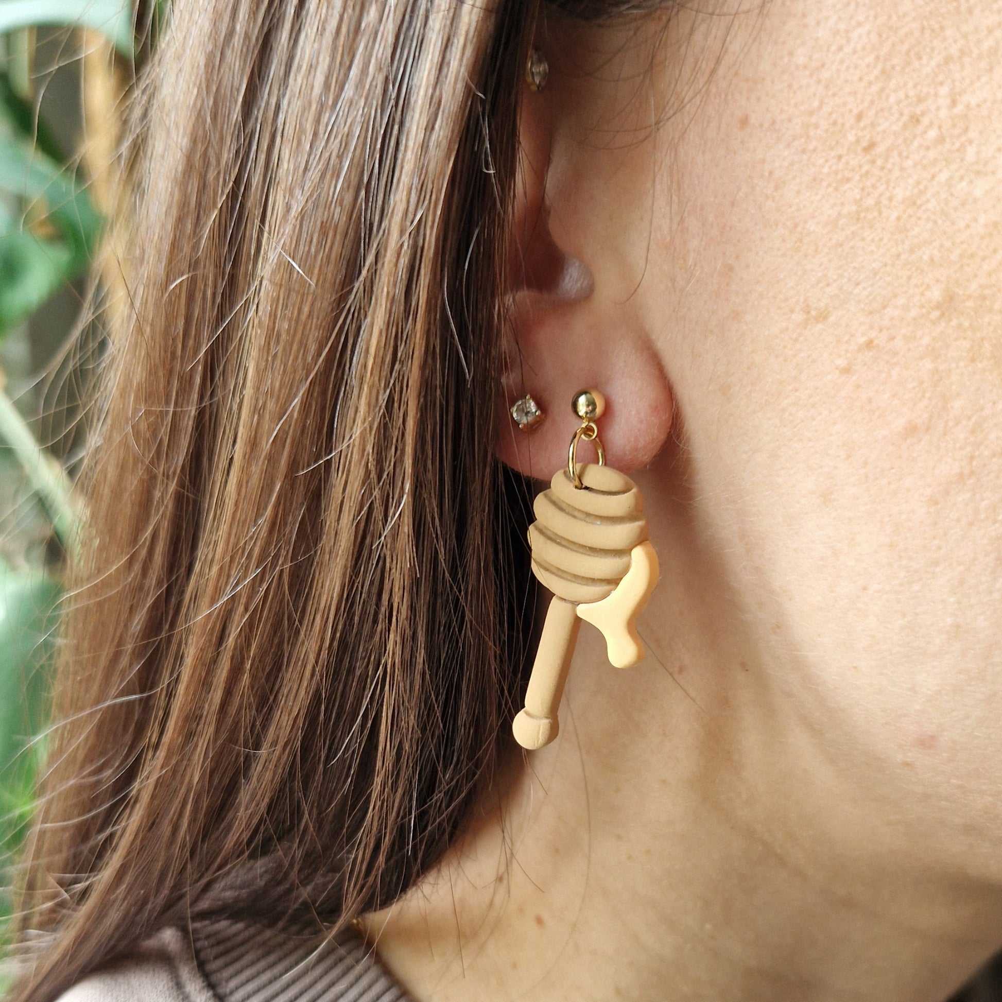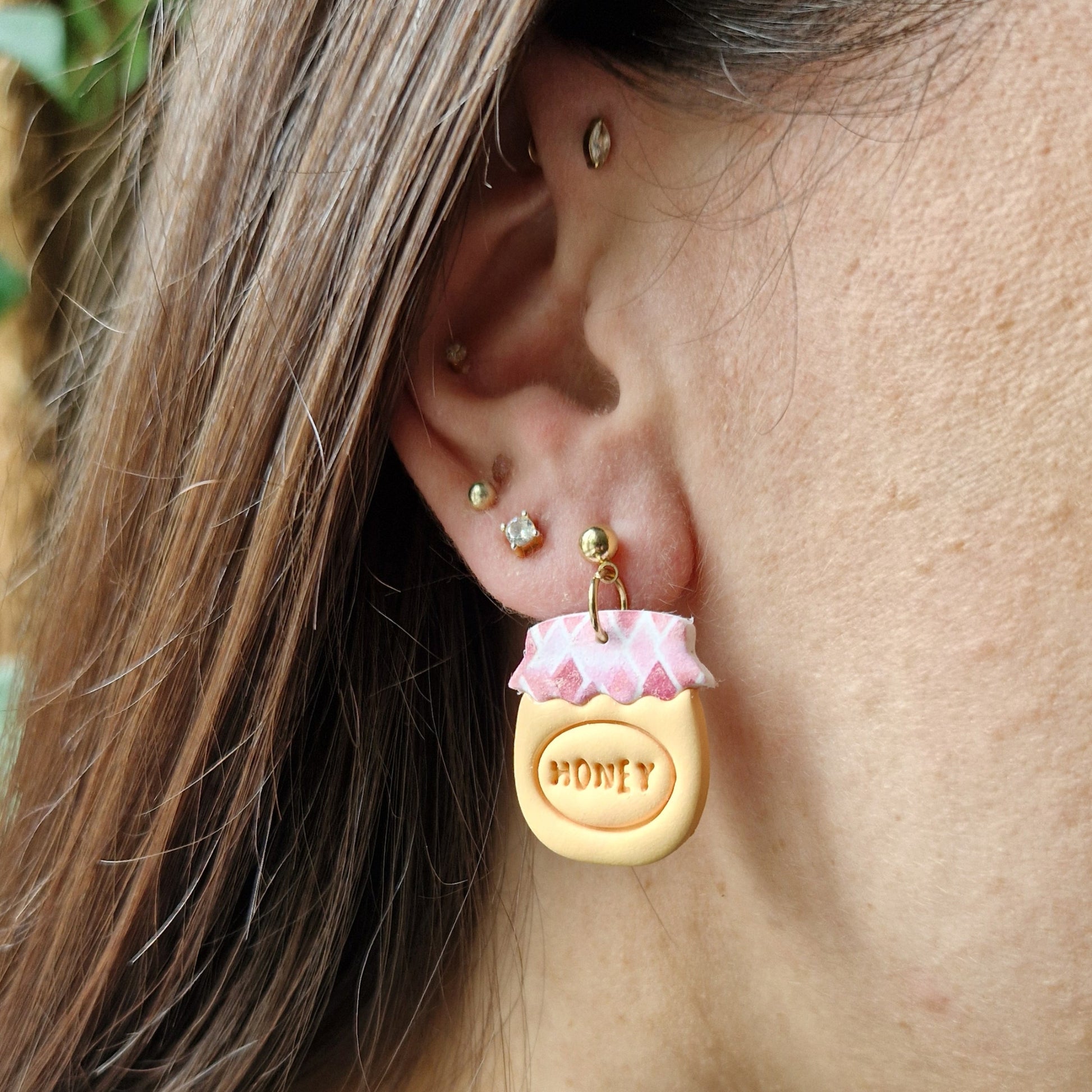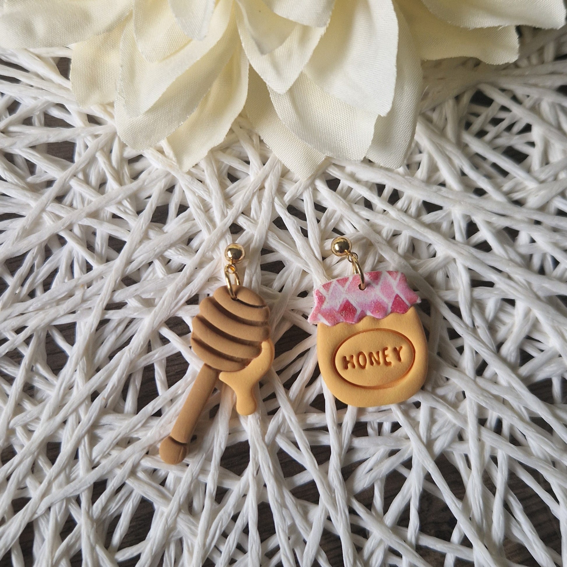The "Jar of Joy" earrings combine two lovingly crafted elements – a traditional honey jar with a red and white checkered lid and a matching honey dipper. These asymmetrical earrings are handcrafted from high-quality polymer clay and will add plenty of charm and warmth to your look.