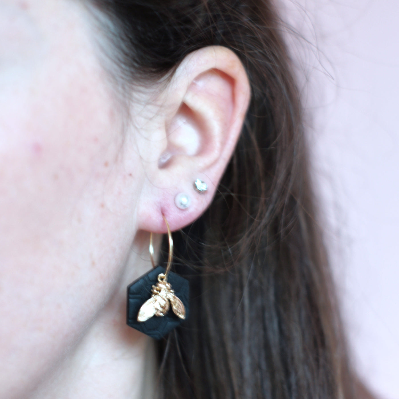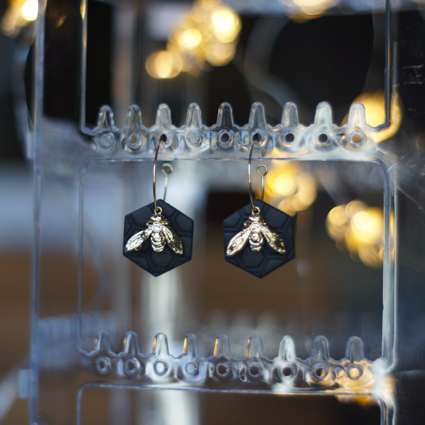 An elegant and original design inspired by the world of bees. The black honeycomb pendant harmonizes perfectly with the golden bee charm, creating a fascinating contrast.