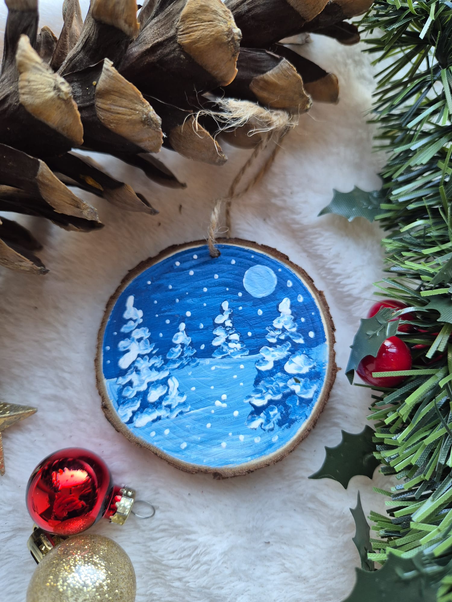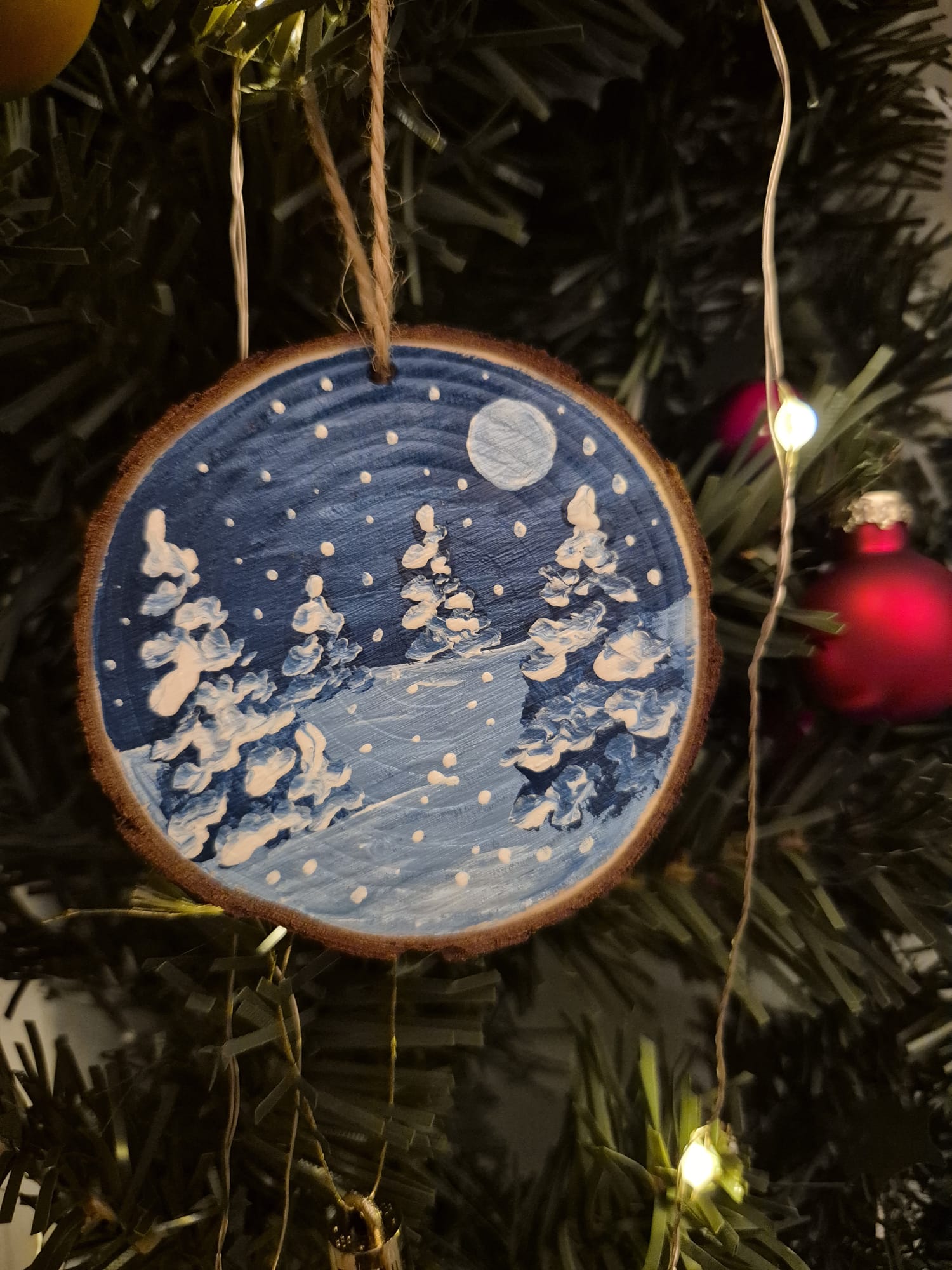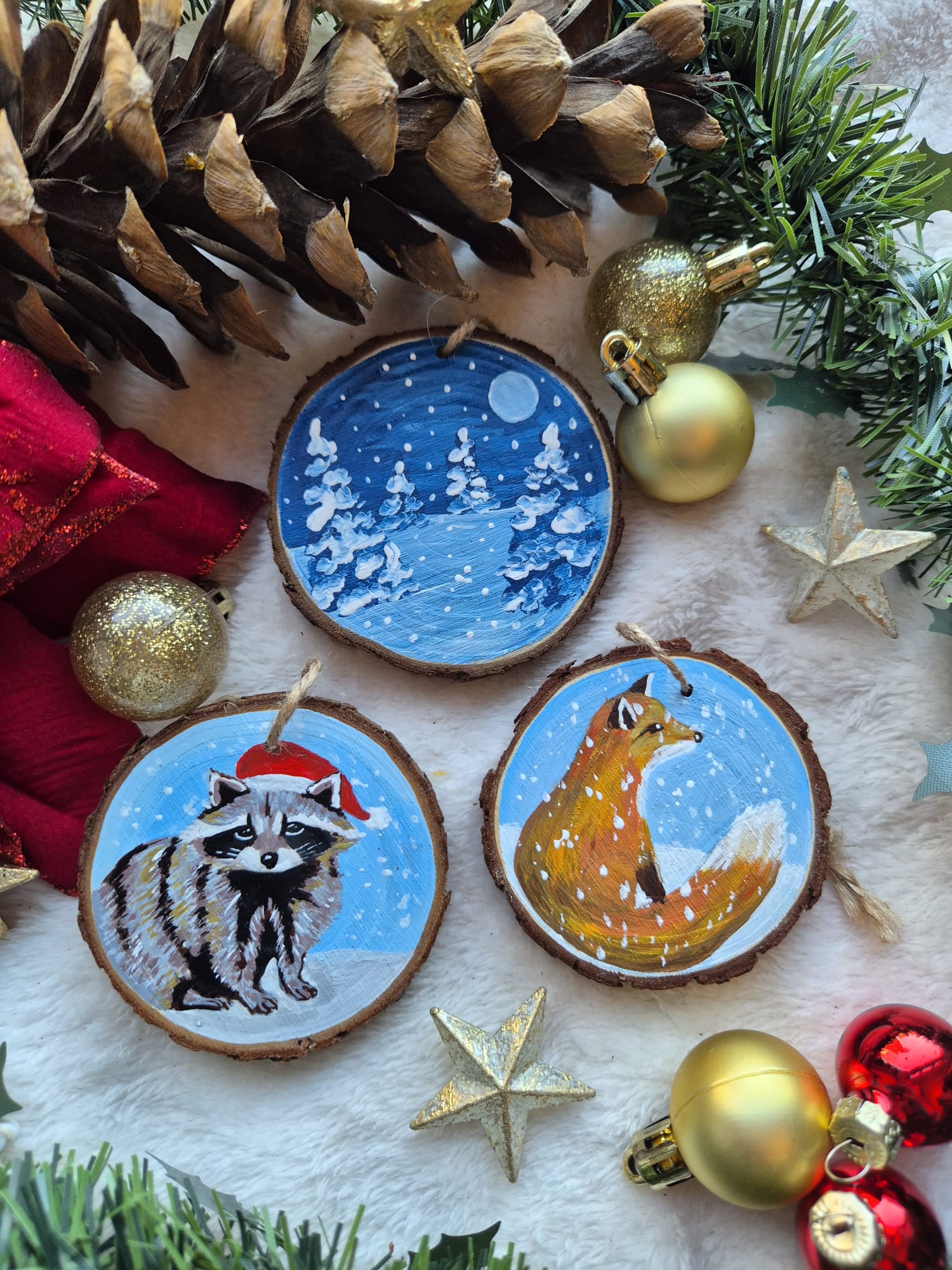 Diese liebevoll handbemalten Baumdekorationen auf natürlichen Holzscheiben (ca. 6–7 cm Durchmesser) bringen echte Wintermagie an deinen Weihnachtsbaum. Jede Scheibe ist ein Unikat und zeigt detailreiche, winterliche Motive, die mit viel Sorgfalt und einem feinen Blick fürs Detail gestaltet wurden.