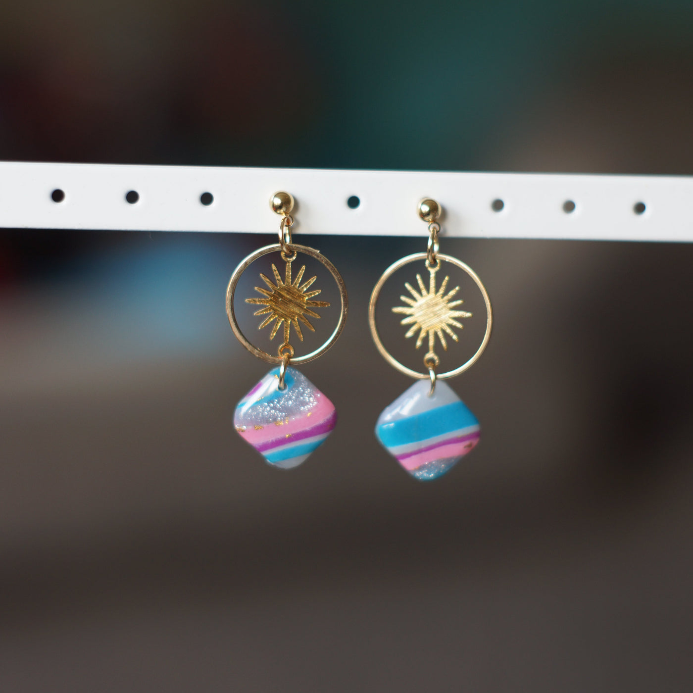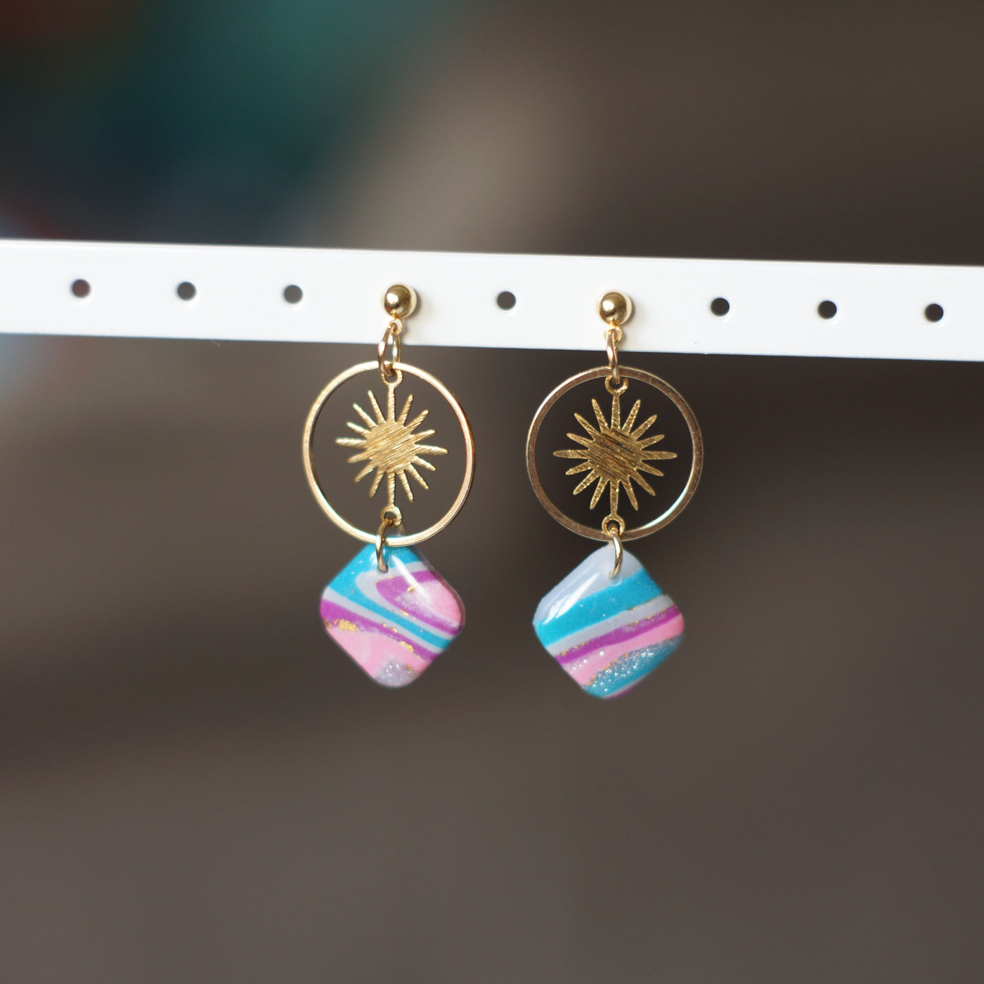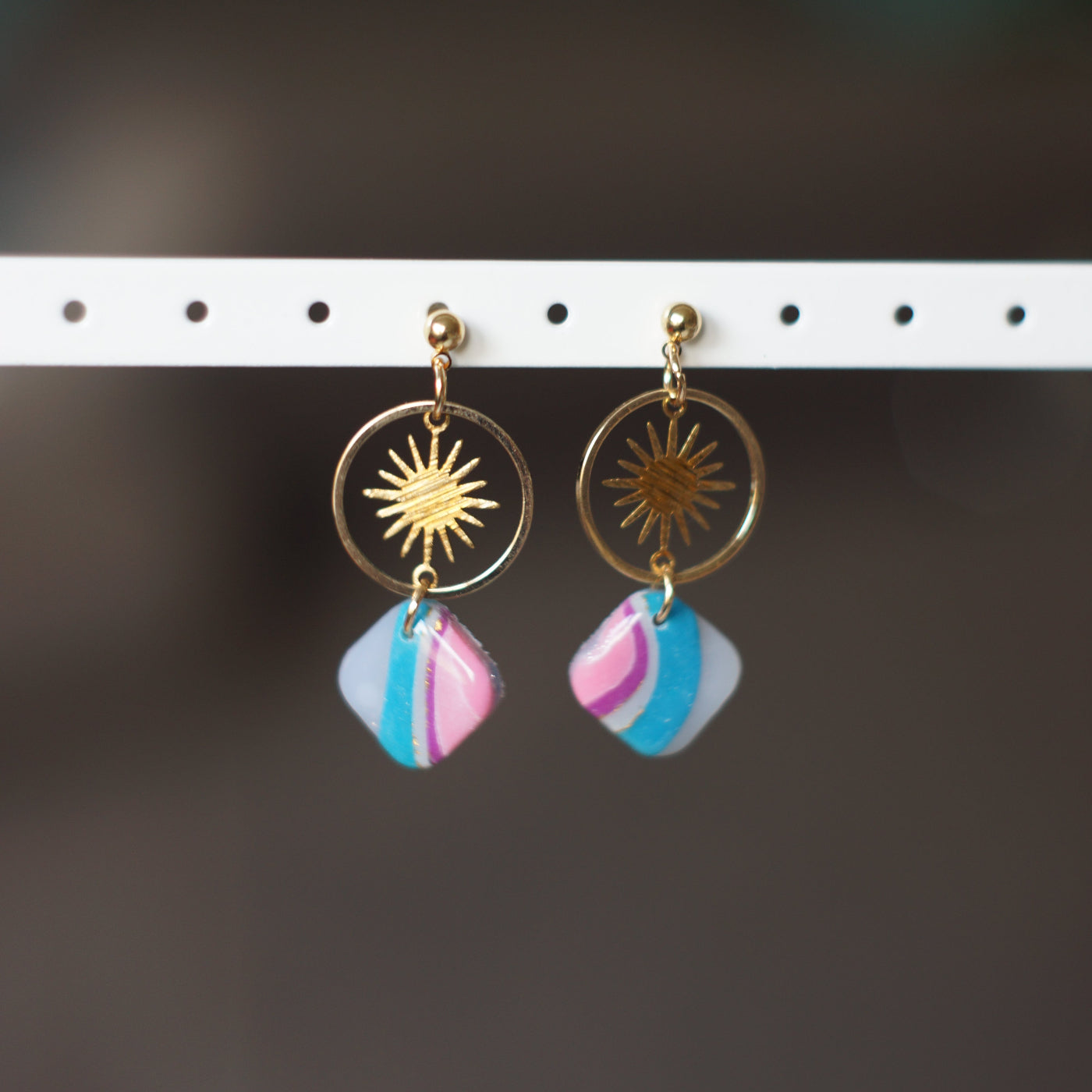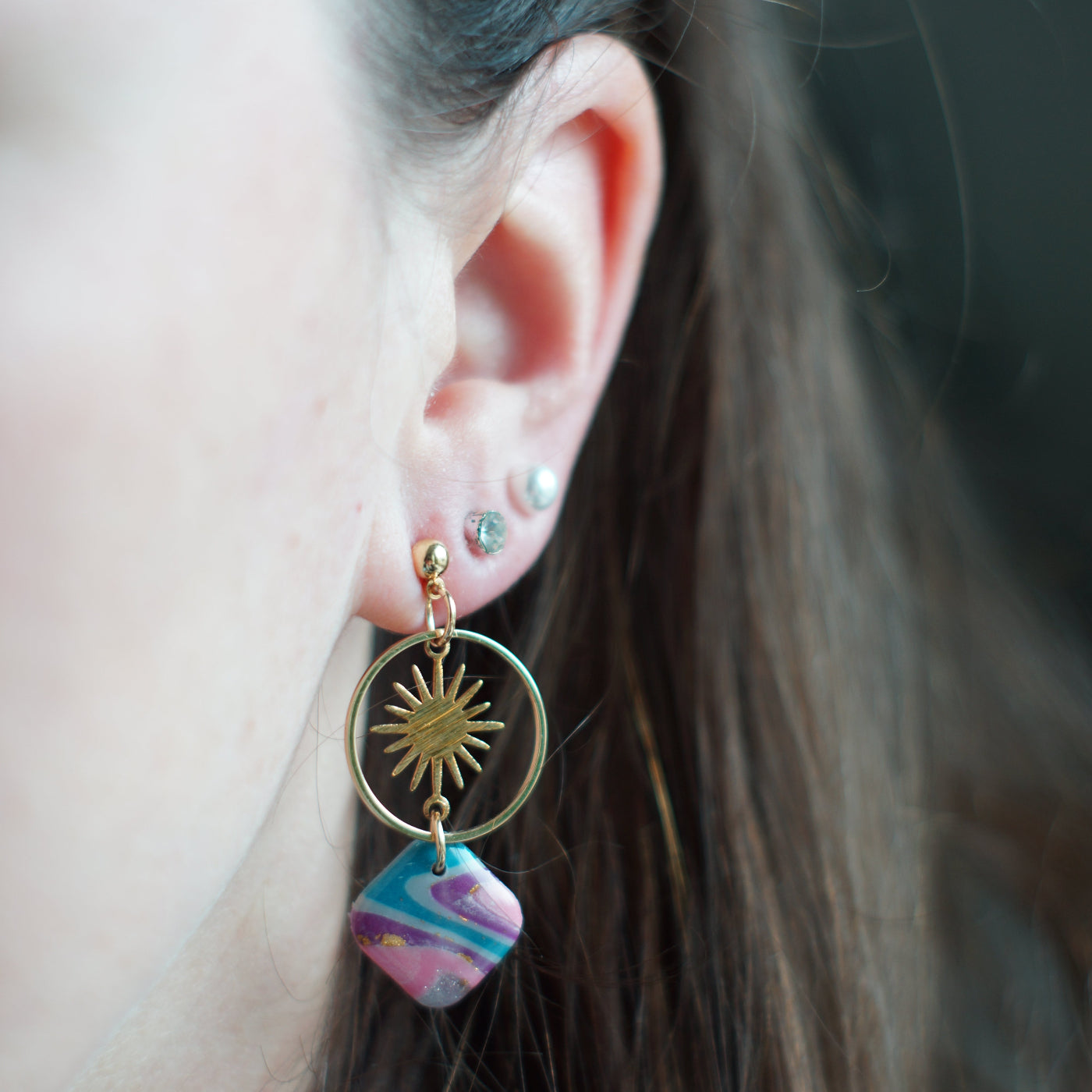 All jewelry pieces are made of polymer clay and lovingly handcrafted. First, the appropriate clay colors are mixed and, if necessary, a pattern is added. The clay is then cut and shaped and placed in the oven for 50 minutes. Once cooled, the pieces are sanded, polished, drilled, and cleaned of fine dust.