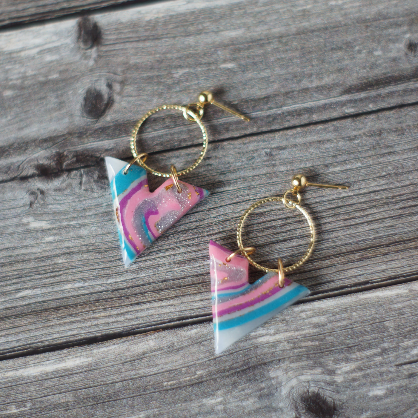 All jewelry pieces are made of polymer clay and lovingly handcrafted. First, the appropriate clay colors are mixed and, if necessary, a pattern is added. The clay is then cut and shaped and placed in the oven for 50 minutes. Once cooled, the pieces are sanded, polished, drilled, and cleaned of fine dust.