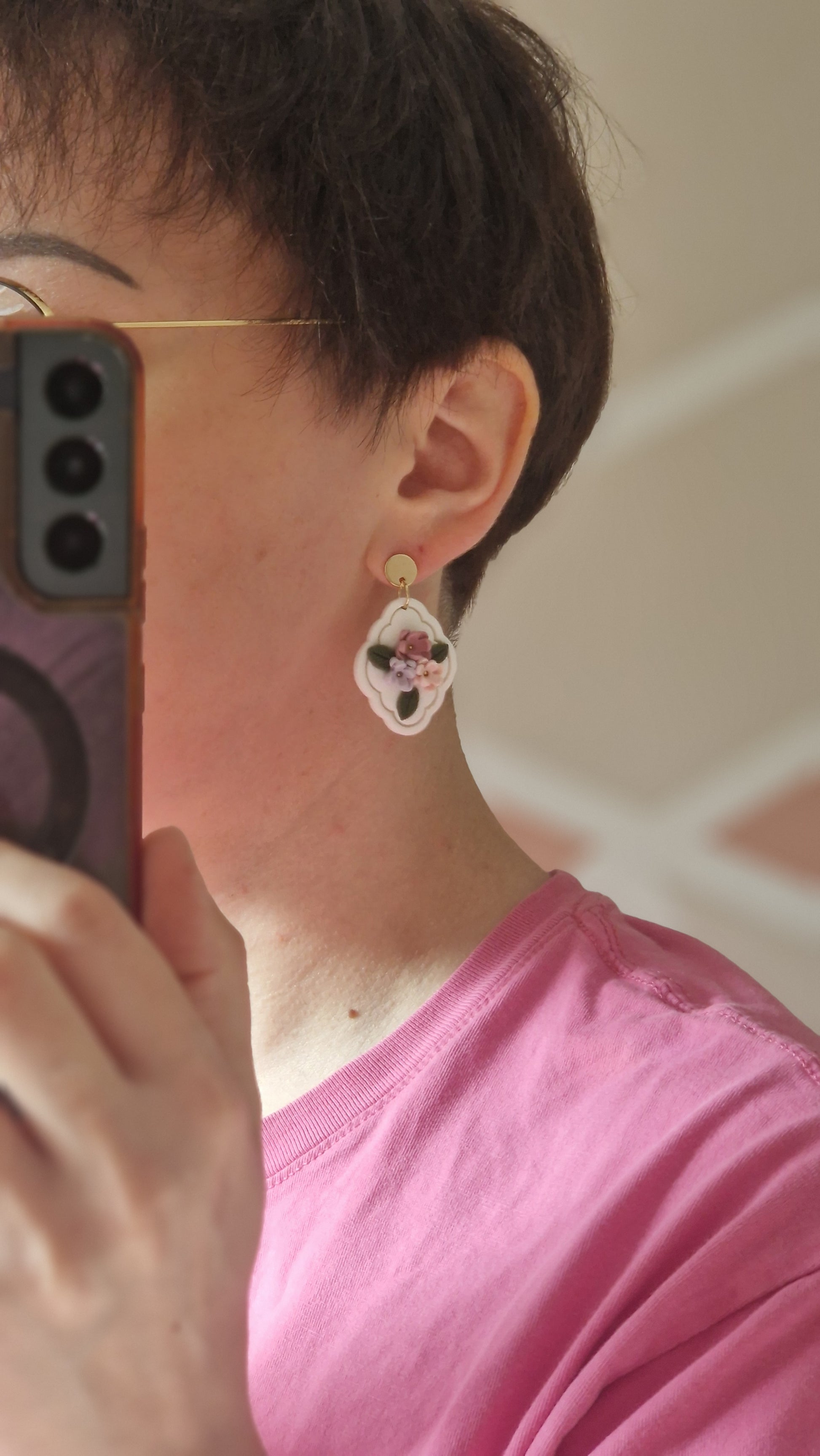 All jewelry pieces are made of polymer clay and lovingly handcrafted. First, the appropriate clay colors are mixed and, if necessary, a pattern is added. The clay is then cut and shaped and placed in the oven for 50 minutes. Once cooled, the pieces are sanded, polished, drilled, and cleaned of fine dust.