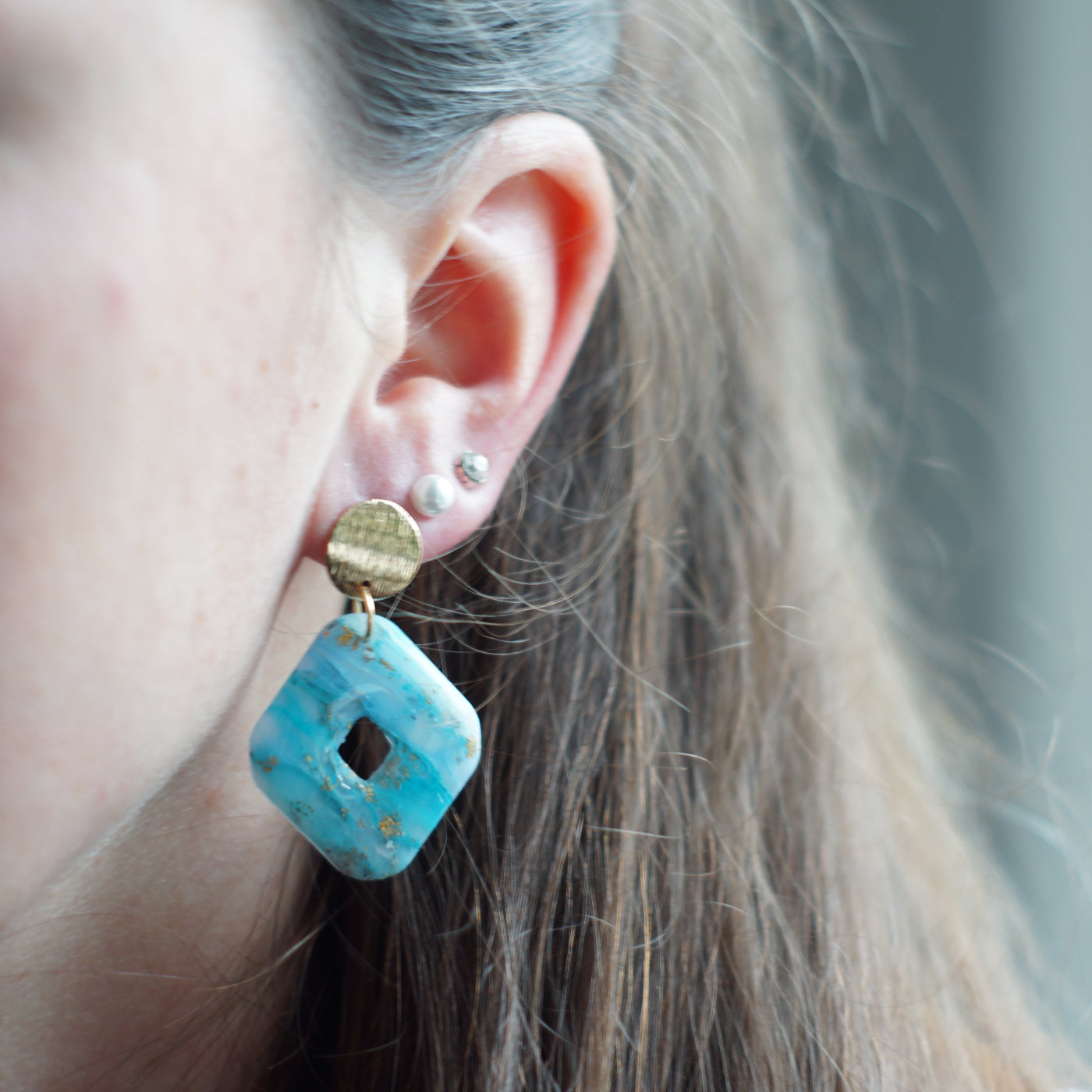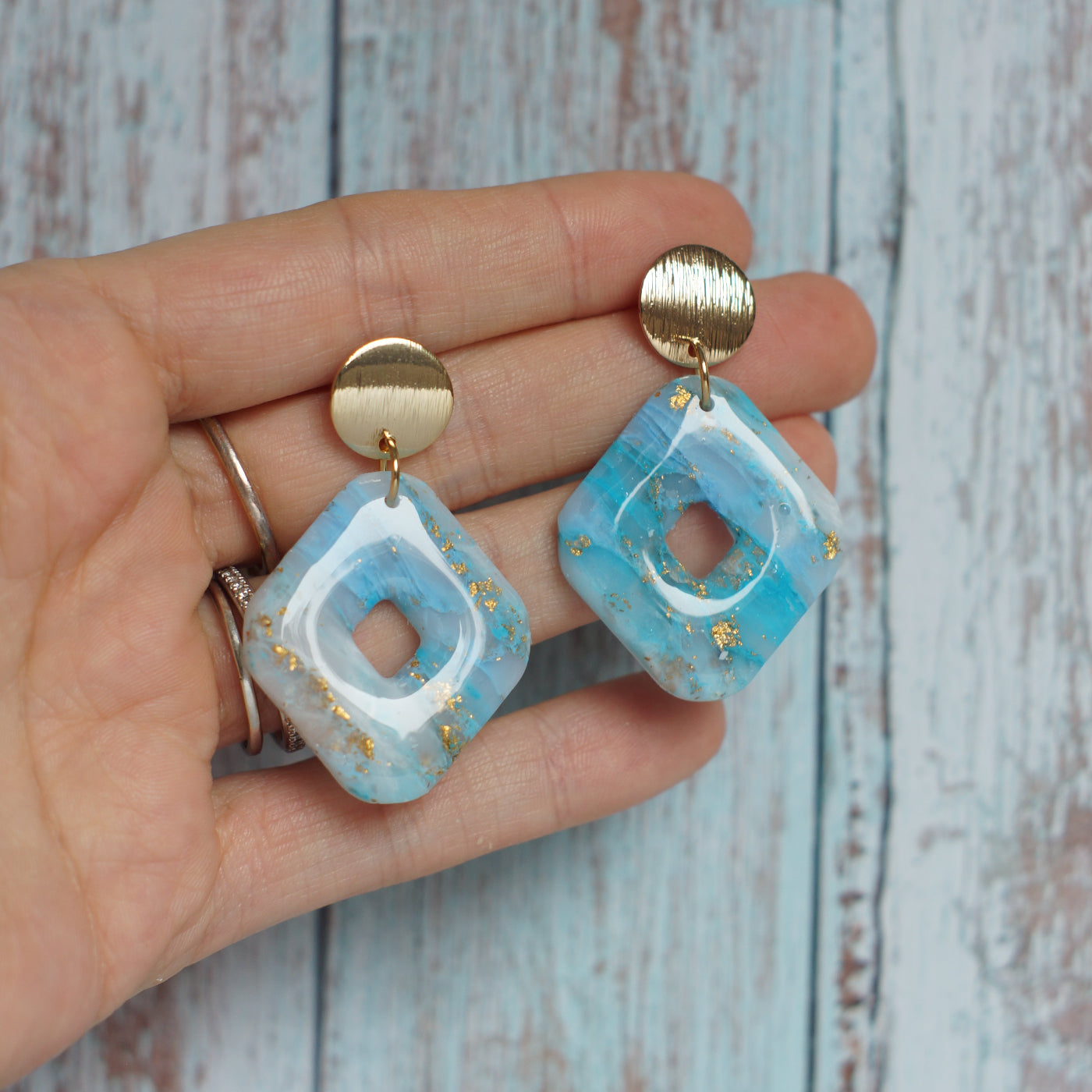 These slightly translucent, ocean-inspired earrings bring the beauty of the sea directly to your ear. Crafted from lightweight, transparent clay with acrylic and resin, they shimmer in soft blue tones with white accents reminiscent of wave-like patterns. They capture the light in a way reminiscent of the ocean depths or the gentle play of water and light.