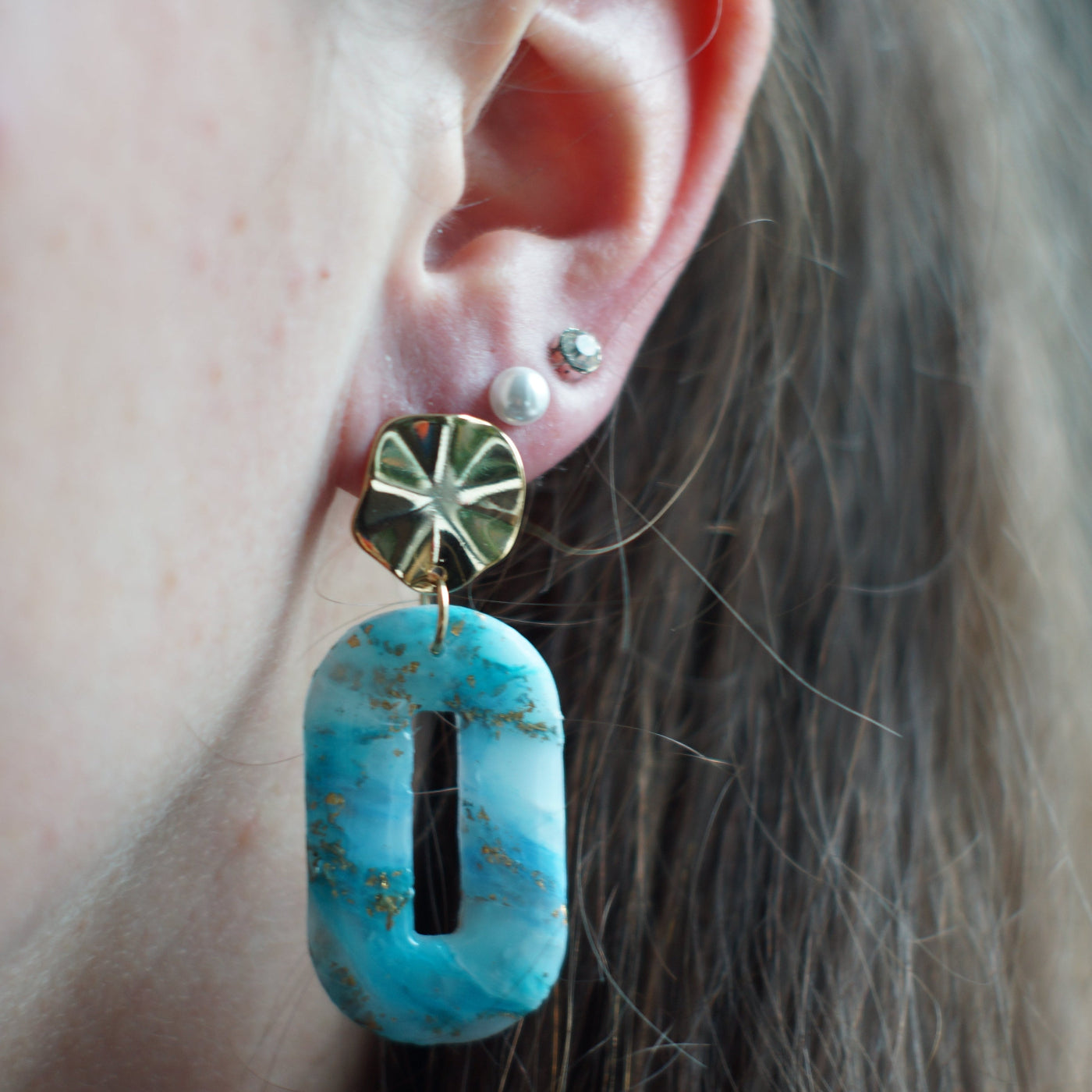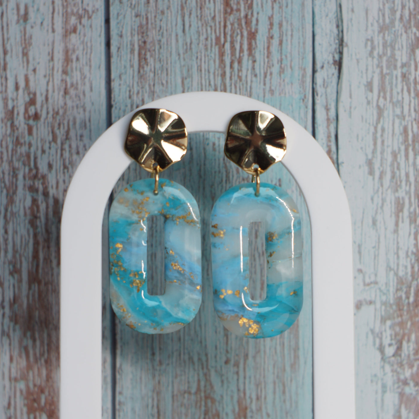 These slightly translucent, ocean-inspired earrings bring the beauty of the sea directly to your ear. Crafted from lightweight, transparent clay with acrylic and resin, they shimmer in soft blue tones with white accents reminiscent of wave-like patterns. They capture the light in a way reminiscent of the ocean depths or the gentle play of water and light.