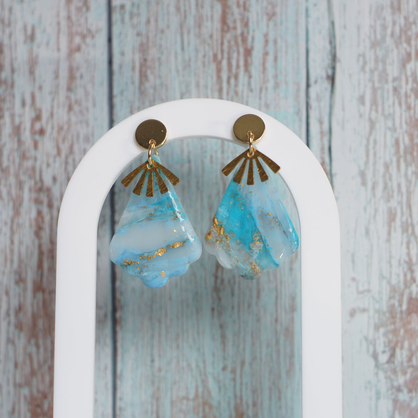 These slightly translucent, ocean-inspired earrings bring the beauty of the sea directly to your ear. Crafted from lightweight, transparent clay with acrylic and resin, they shimmer in soft blue tones with white accents reminiscent of wave-like patterns. They capture the light in a way reminiscent of the ocean depths or the gentle play of water and light.