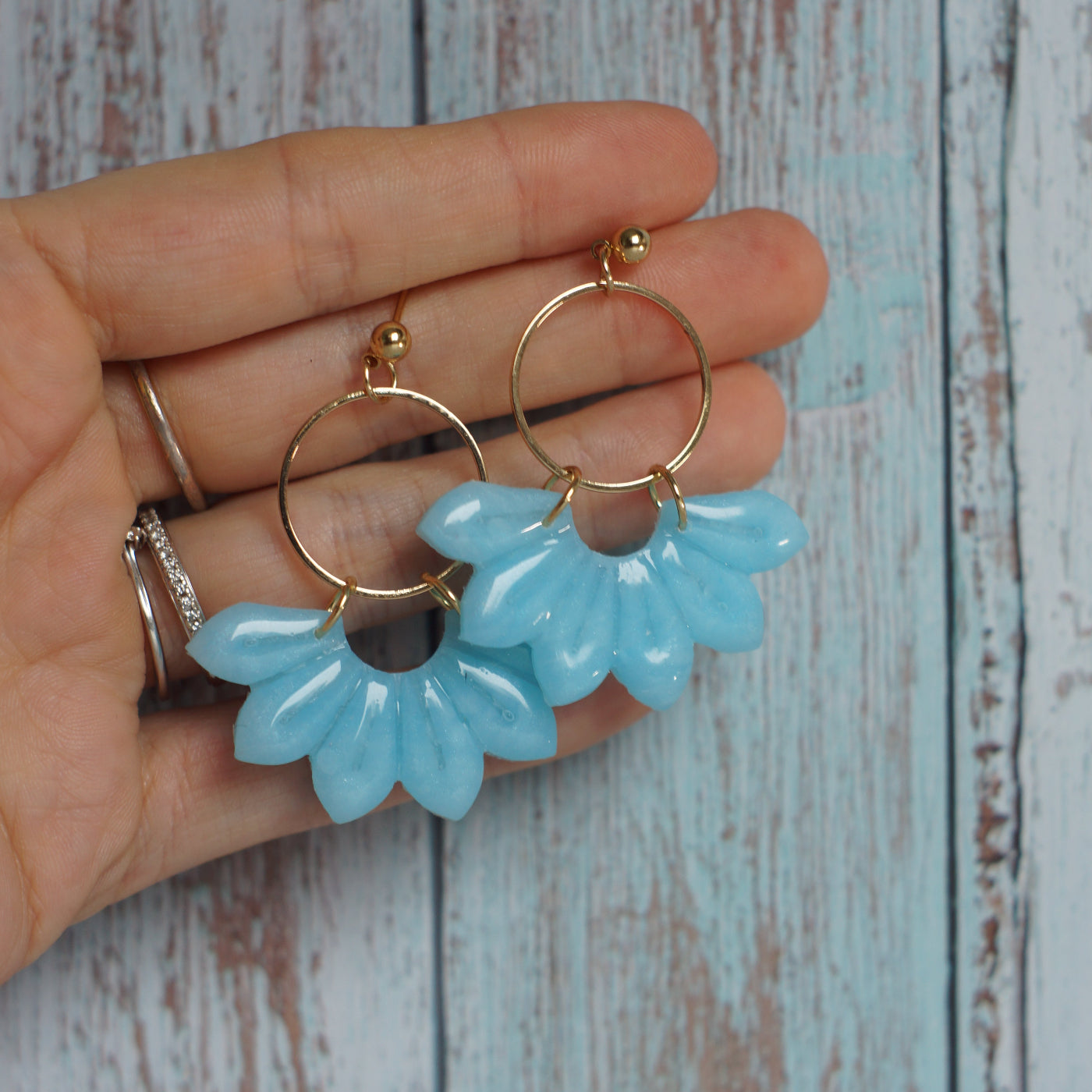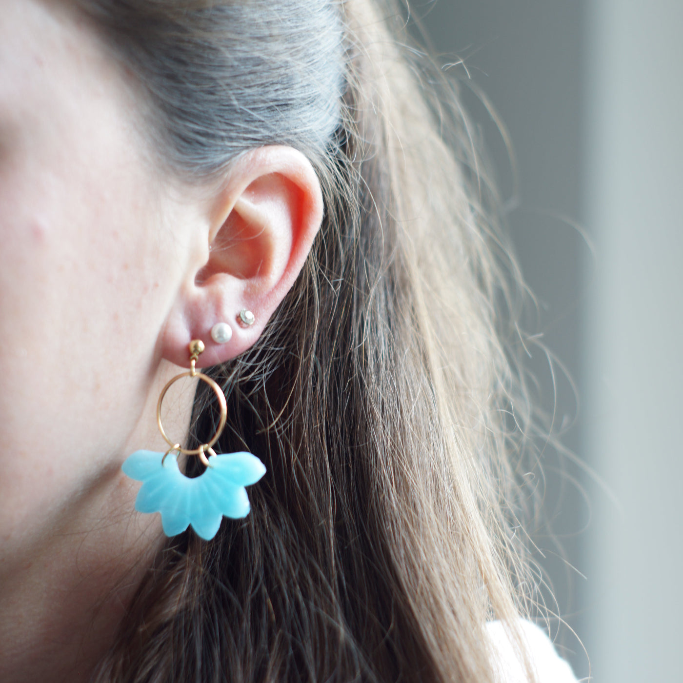 All jewelry pieces are made of polymer clay and lovingly handcrafted. First, the appropriate clay colors are mixed and, if necessary, a pattern is added. The clay is then cut and shaped and placed in the oven for 50 minutes. Once cooled, the pieces are sanded, polished, drilled, and cleaned of fine dust.