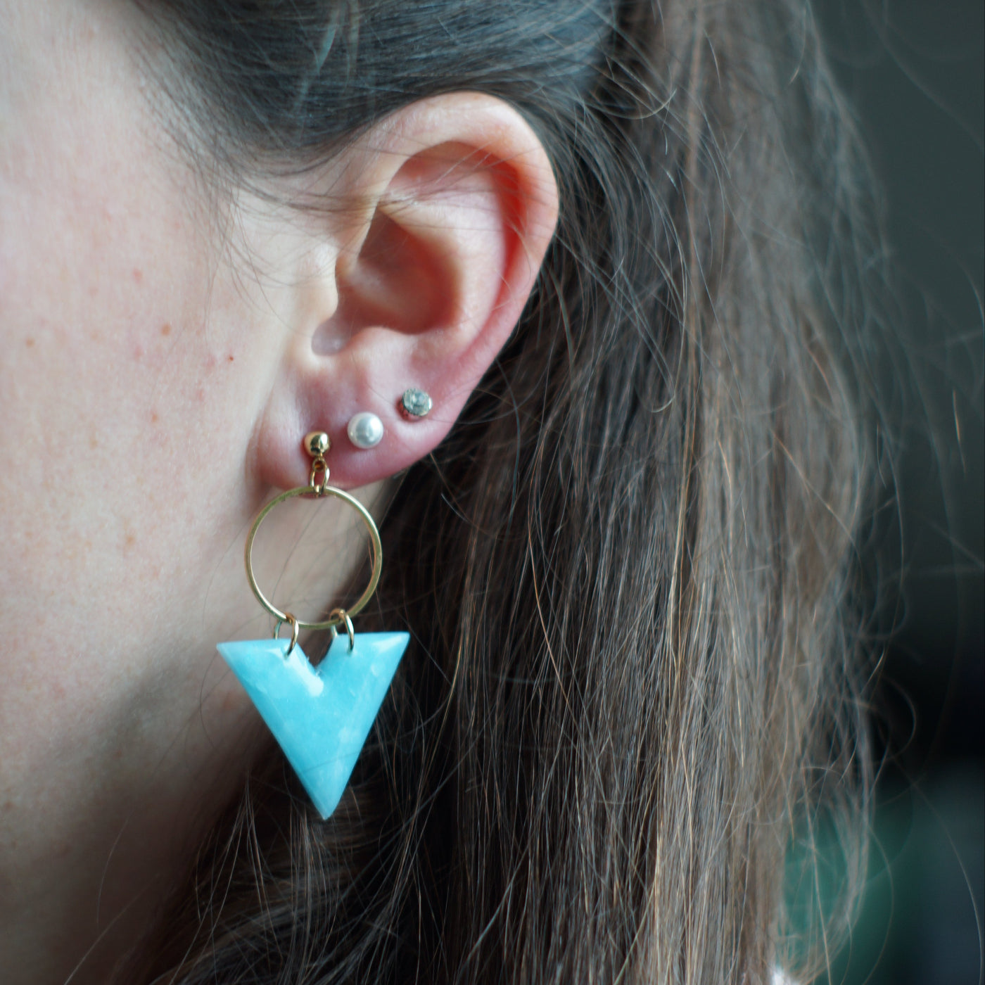 All jewelry pieces are made of polymer clay and lovingly handcrafted. First, the appropriate clay colors are mixed and, if necessary, a pattern is added. The clay is then cut and shaped and placed in the oven for 50 minutes. Once cooled, the pieces are sanded, polished, drilled, and cleaned of fine dust.