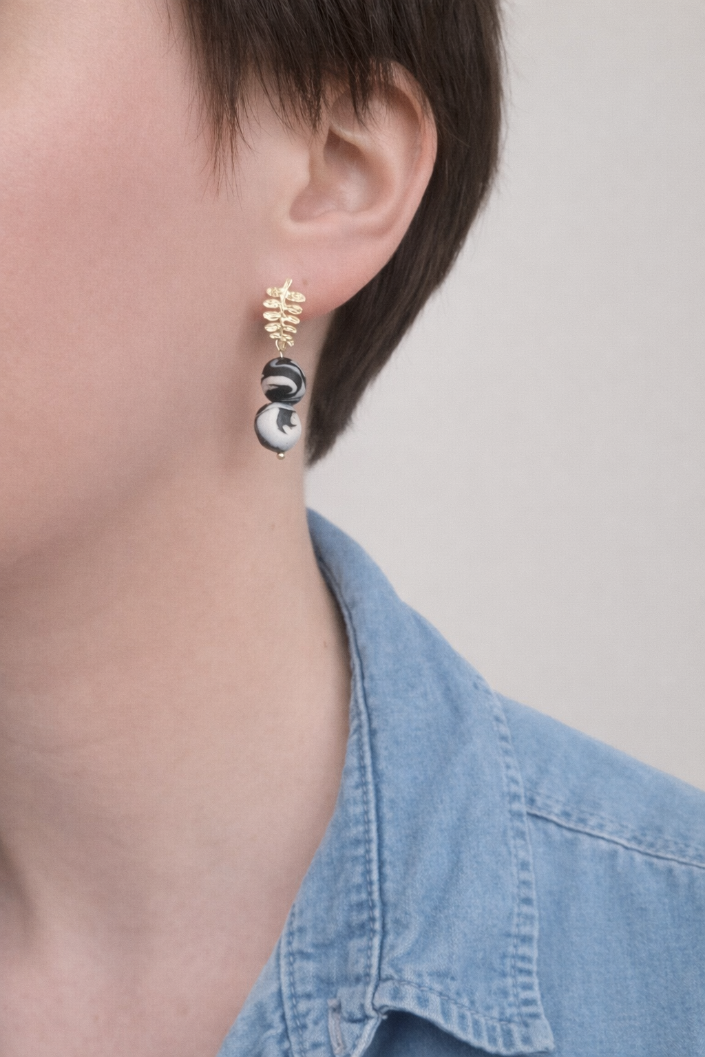 Klare Kontraste, die sofort ins Auge fallen: Diese handgefertigten Ohrringe spielen mit tiefem Schwarz und hellem Weiß in einer marmorierten Optik, die bei jeder Perle anders verläuft. Keine Kugel gleicht der anderen, jede zeigt ihre eigene kleine Bewegung aus Linien und Wirbeln.